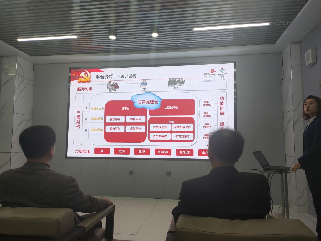 在大数据中心,委员们听取了关于甘肃党建信息化平台的介绍,了解了项目背景、设计思路、设计原则、设计构架、平台特点以及建设情况,通过观看支部标准化建设的进度、大数据中心效果图、党务服务效果图,明确了今后利用甘肃党建平台的重要性。