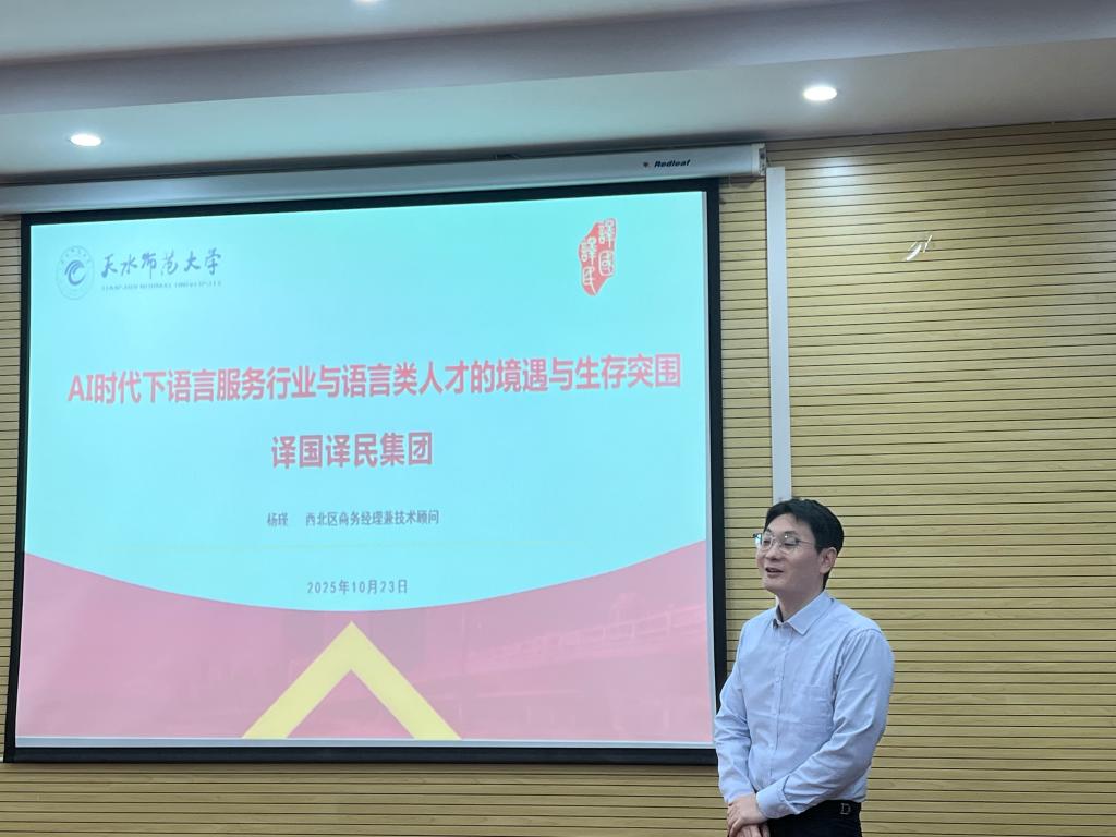 2025年10月23日下午3点,KY开元集团官网入口邀请译国译民西安百思乐教育咨询有限公司技术顾问、译国译民西北地区商务经理杨瑾,在2教425教室作题为《AI时代下语言服务行业与语言人才的境遇与突围》的专题报告。学院部分教师、翻译专业研究生及本科生共80余人到场聆听,共同探讨AI浪潮下语言服务行业的发展与人才培养新路径。