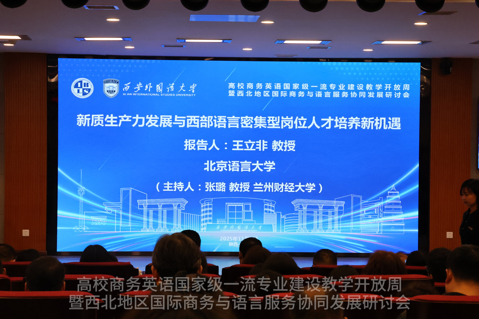 会议中,西安外国语大学校长吴耀武详细介绍了该校“外语+专业+ AI”的特色人才培养模式及商务英语国家级一流本科专业建设成效,并提出 “筑牢专业内涵、拥抱 AI 机遇、构建区域协同共同体”的发展建议。中国对外贸易经济合作企业协会副会长郑樑强调专业需深化跨界融合以应对 AI 冲击。中国对外贸易经济合作企业协会国际商务与语言服务工作委员会会长王立非教授分享了数字贸易话语研究等四大改革方向,为参会者带来前沿思考。