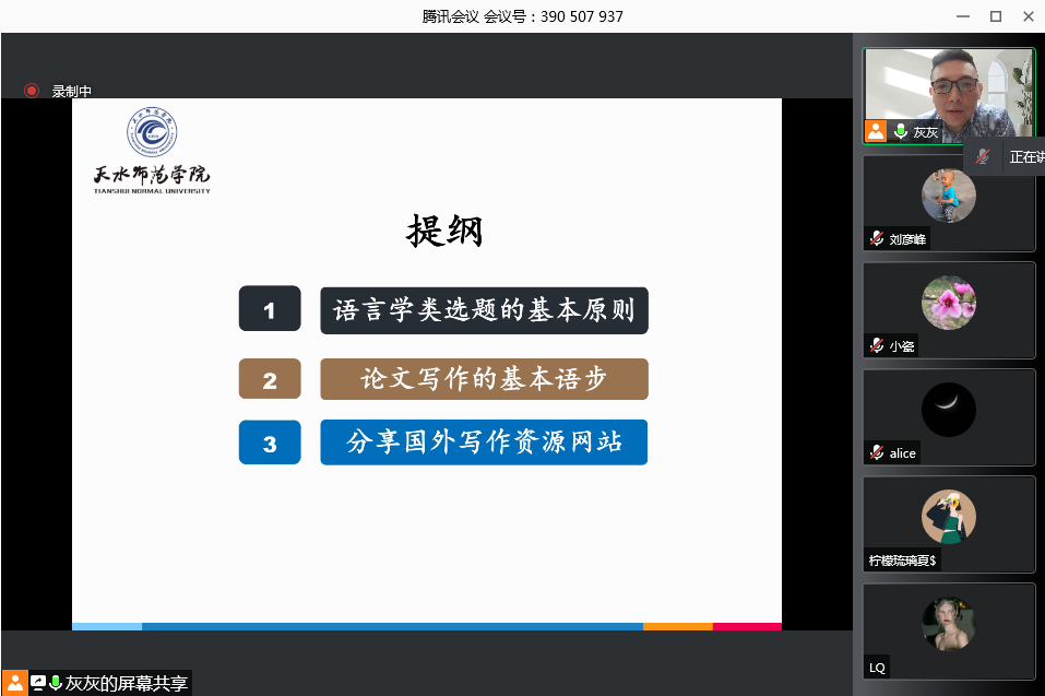 20211121日晚八点,张晖老师通过腾讯会议平台为英语专业本科生作了题为《语言学类论文的选题与写作规范》的报告。张晖老师的讲座旨在向同学们介绍语言学类论文选题的基本原则和英语学术论文写作的基本规范。