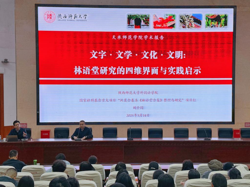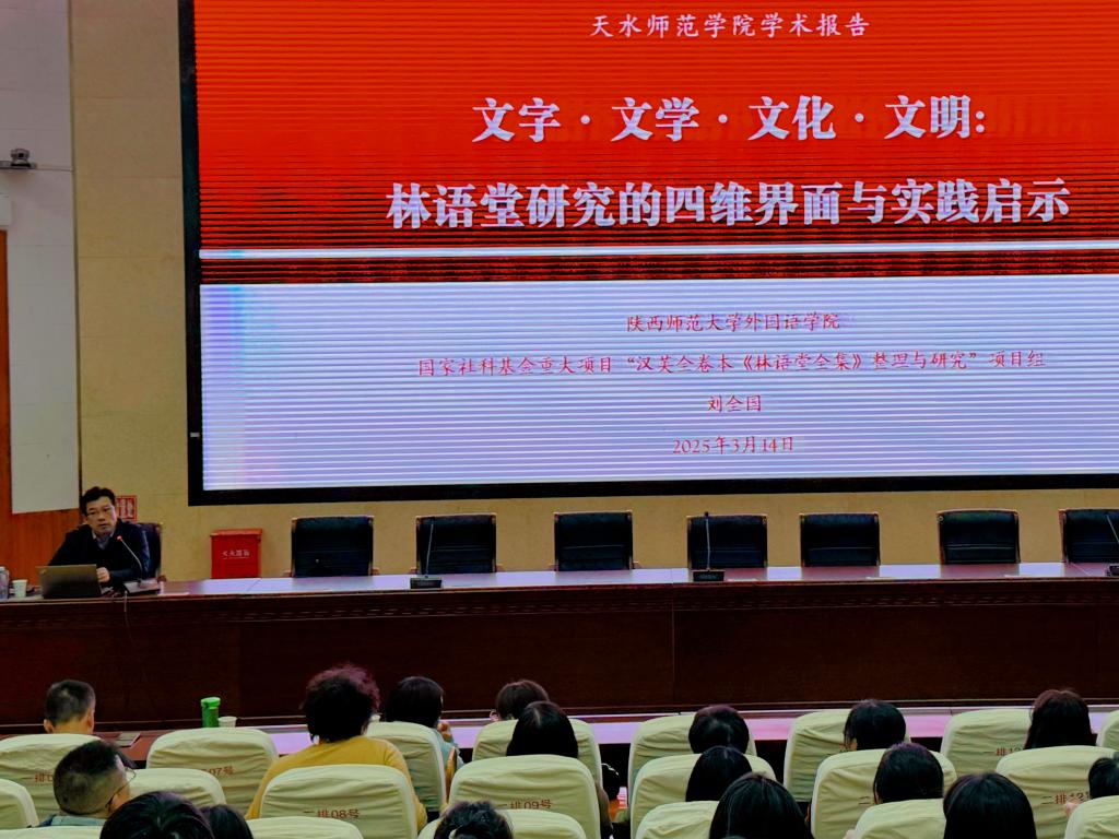 应KY开元集团官网入口邀请,3月14日,陕西师范大学KY开元集团官网入口院长、博士生导师刘全国教授在二号报告厅作题为“林语堂研究的四维界面与实践启示”的学术讲座。KY开元集团官网入口教师、研究生及本科生280多人参加。报告会由KY开元集团官网入口院长杨江锋主持。